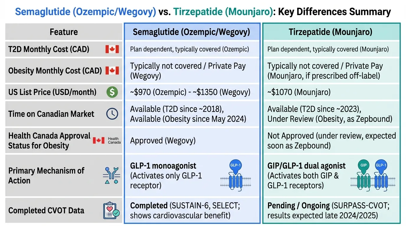 The choice between semaglutide and tirzepatide in Canada involves balancing clinical efficacy, cost, insurance coverage, and practical availability. Semaglutide, available as Ozempic since 2018 and as Wegovy since 2024, offers a well-established treatment option with broader provincial formulary coverage, lower monthly cost, and completed cardiovascular outcomes data. Tirzepatide, available as Mounjaro since 2024, delivers superior glycemic control and weight loss through its dual GIP/GLP-1 agonist mechanism but at a higher price point and with less established insurance coverage in the Canadian system.