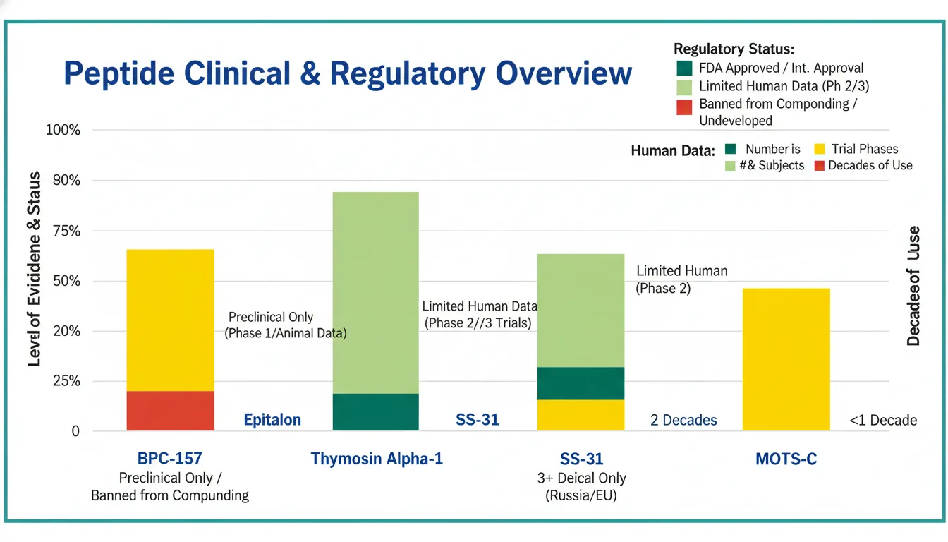 Evidence quality varies dramatically. Thymosin Alpha-1 and SS-31 have substantial human data. BPC-157 and Epitalon have limited human data. MOTS-C has none. These should not be treated as equivalent.