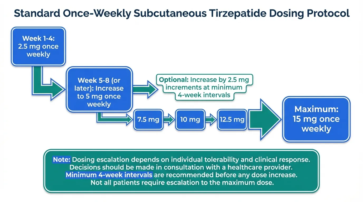Available formulations and doses: Tirzepatide is supplied as single-dose, pre-filled auto-injector pens for subcutaneous injection. Six dose strengths are available: 2.5 mg, 5 mg, 7.5 mg, 10 mg, 12.5 mg, and 15 mg. The standard dosing protocol initiates treatment at 2.5 mg once weekly for four weeks, then increases to 5 mg once weekly. Subsequent dose escalations of 2.5 mg increments occur at minimum four-week intervals, based on individual tolerability and clinical response, up to a maximum of 15 mg weekly.
