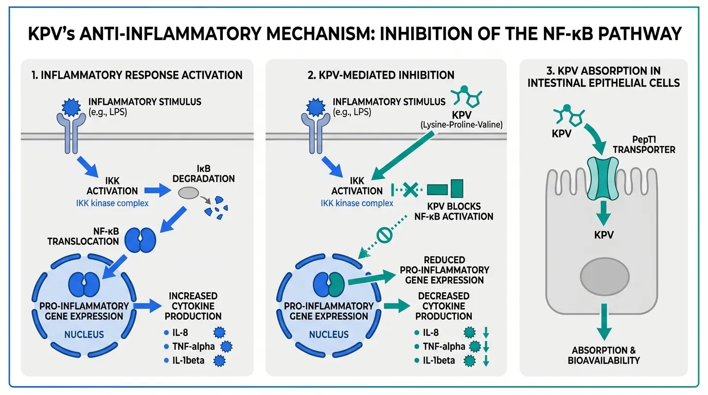 KPV's primary mechanism is inhibition of the NF-kappaB signaling pathway, a master regulator of inflammatory gene expression. Studies have demonstrated dose-dependent suppression of NF-kappaB activation and downstream reduction of pro-inflammatory cytokines including IL-8, TNF-alpha, and IL-1beta.