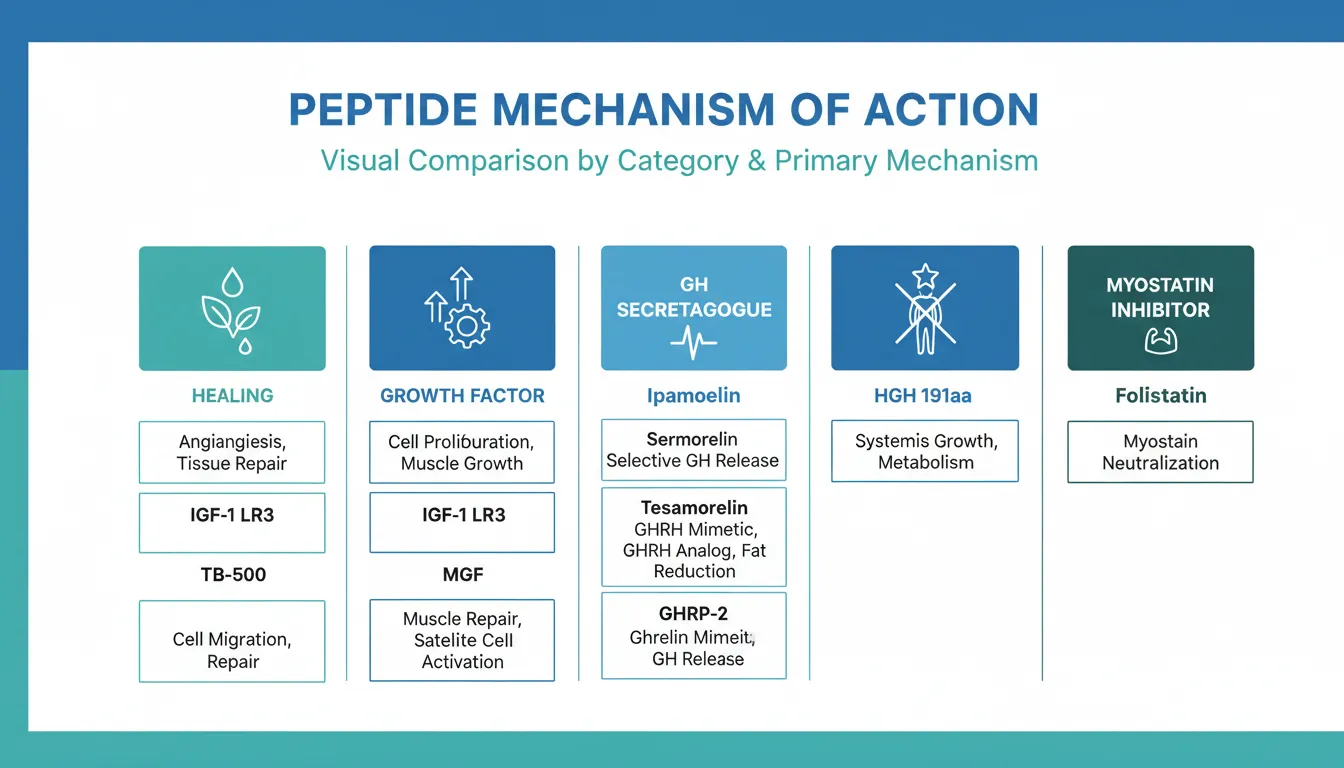 - Indirect via GH/IGF-1 axis: Ipamorelin, sermorelin, GHRP-2, tesamorelin stimulate GH, which then drives muscle effects
