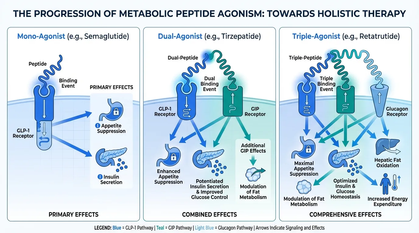 Retatrutide exemplifies the cutting edge of metabolic peptide development. As a triple agonist targeting GIP, GLP-1, and glucagon receptors simultaneously, Retatrutide represents the progression from single-target GLP-1 agonists (like semaglutide) through dual agonists (like tirzepatide) to triple agonists. In Phase 2 trials, Retatrutide demonstrated up to 24.2% body weight reduction at 48 weeks, with significant reductions in liver fat attributed to its glucagon receptor component. The triple-agonist approach addresses obesity through complementary mechanisms: GLP-1 and GIP suppress appetite and enhance insulin secretion, while glucagon promotes hepatic fat oxidation and increases energy expenditure.