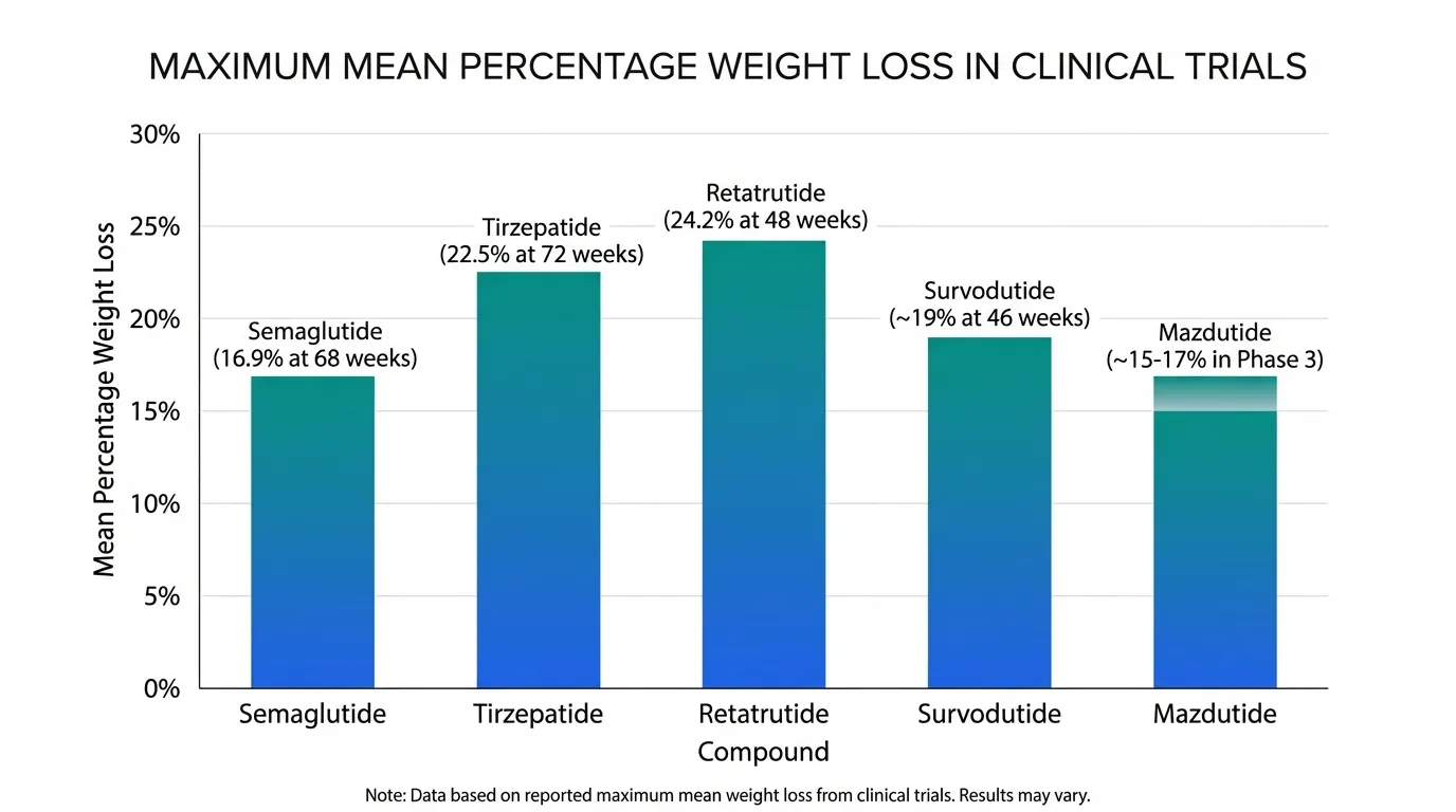 | Maximum Weight Loss | ~17% (68 wk) | ~20.9% (72 wk) | ~24.2% (48 wk) | ~19% (46 wk) | ~17% (Phase 3) |