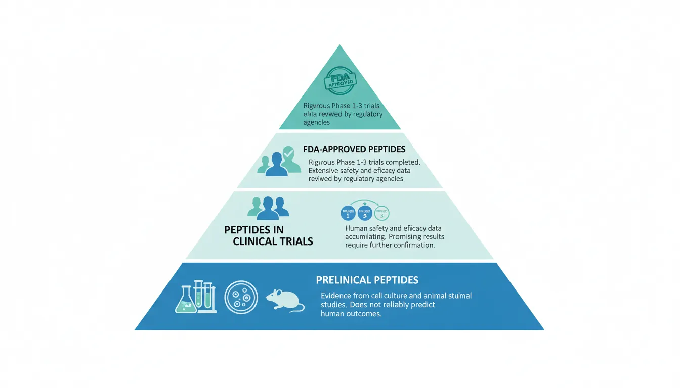 FDA-approved peptides (e.g., semaglutide, tirzepatide, tesamorelin) have undergone rigorous Phase 1-3 clinical trials involving thousands of human participants, with safety and efficacy data reviewed by regulatory agencies. The evidence base for these compounds is extensive and high-quality.
